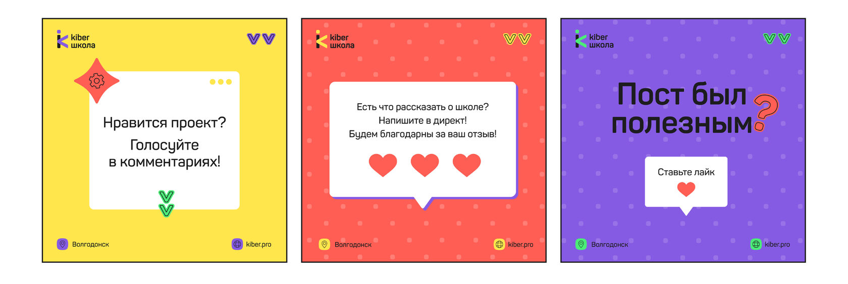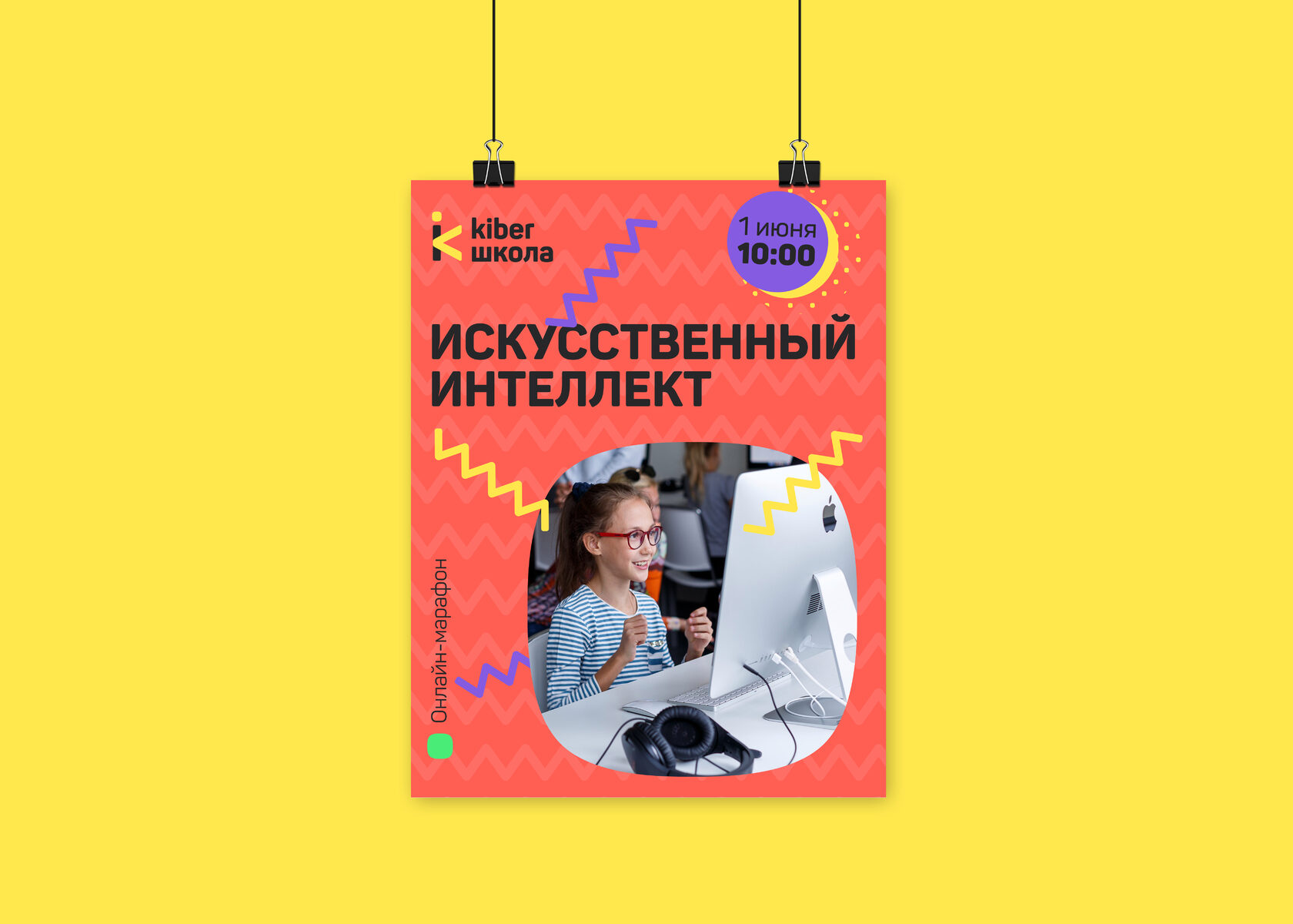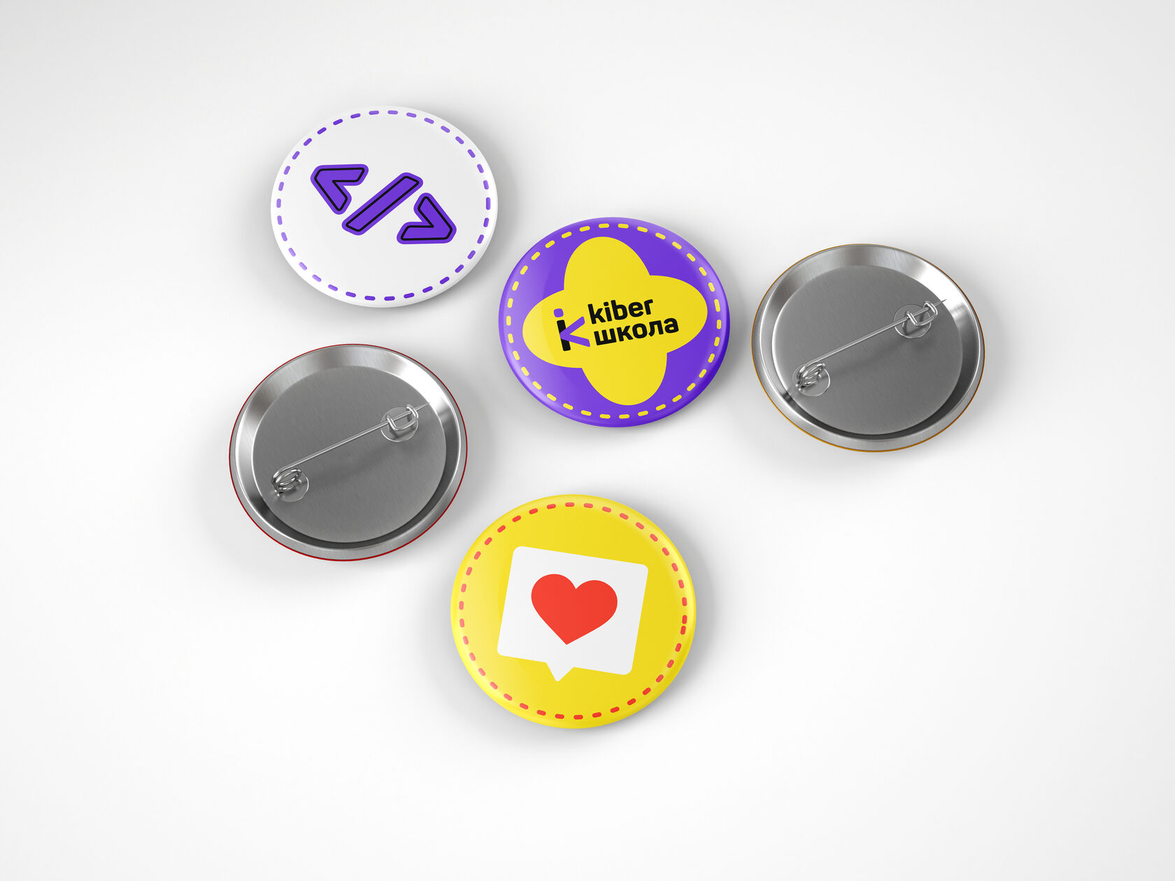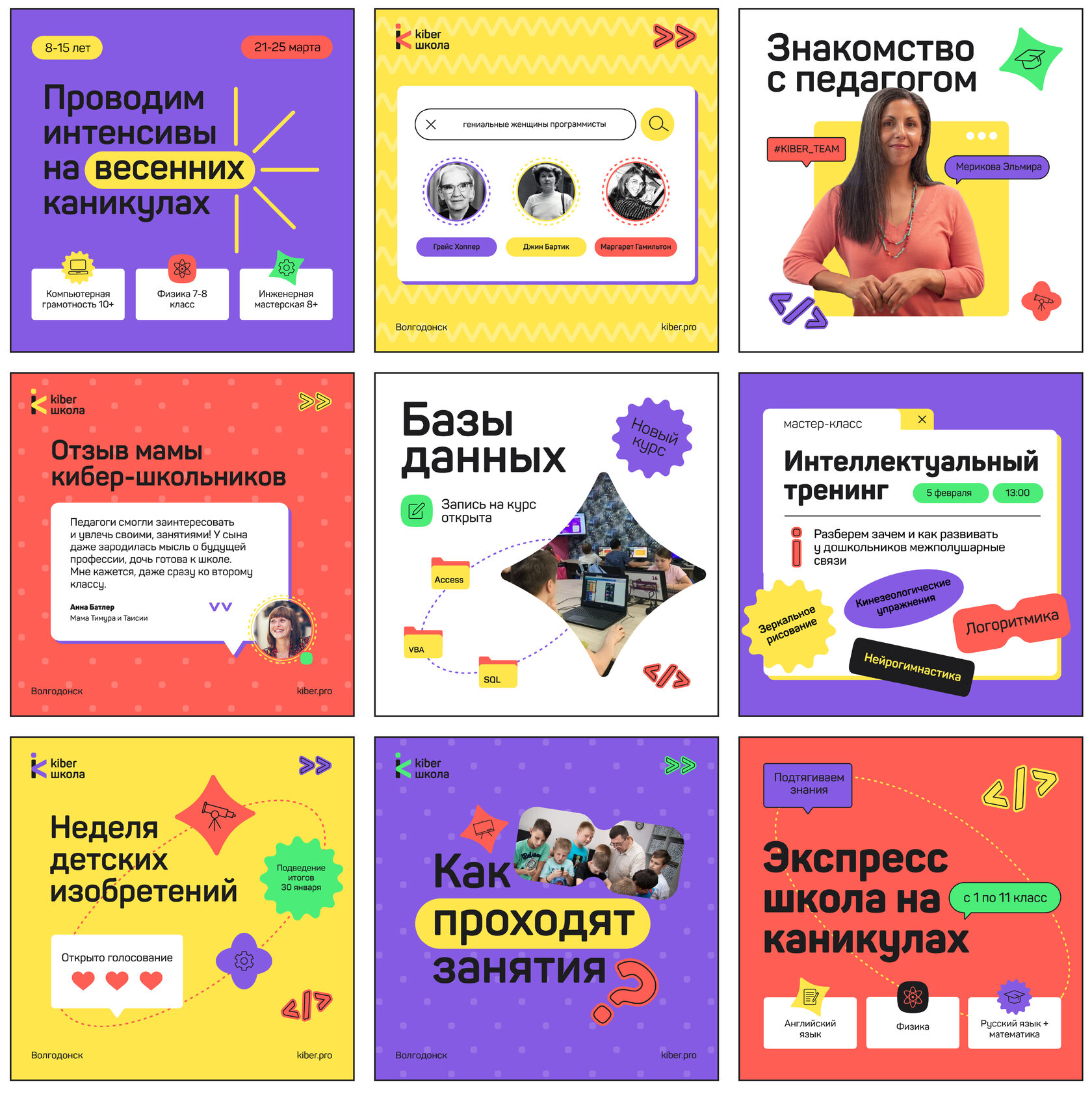 Основная деятельность кибершколы — обучение детей и подростков компьютерным и техническим дисциплинам. Айдентика школы сочетает стиль дизайн-систем Memphis и UI: здесь есть яркие цвета, паттерны на фоне, элементы компьютерных интерфейсов, стикеры. Такой визуальный стиль подчеркивает характер деятельности школы и привлекает внимание целевой аудитории.