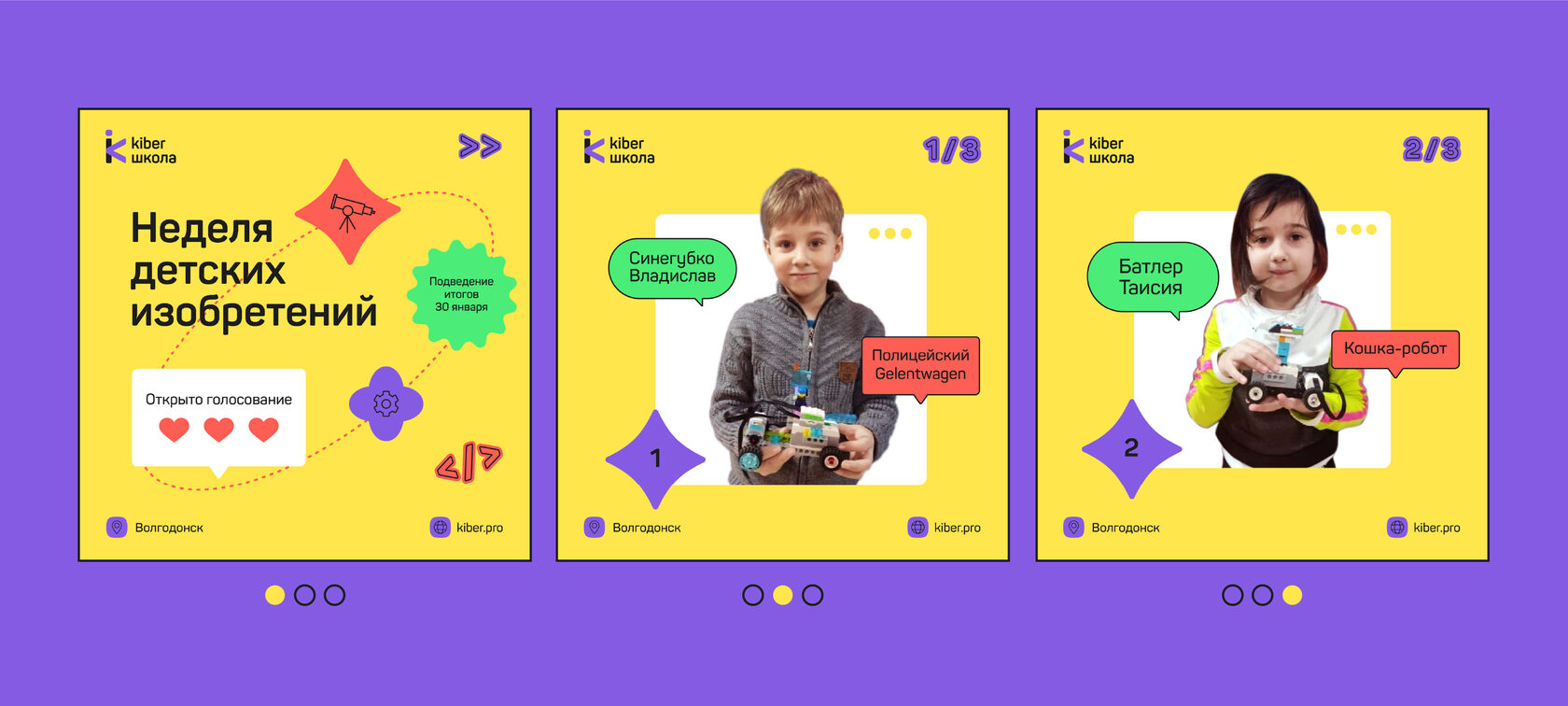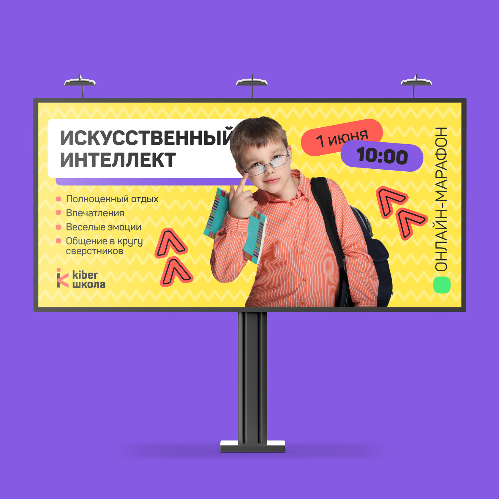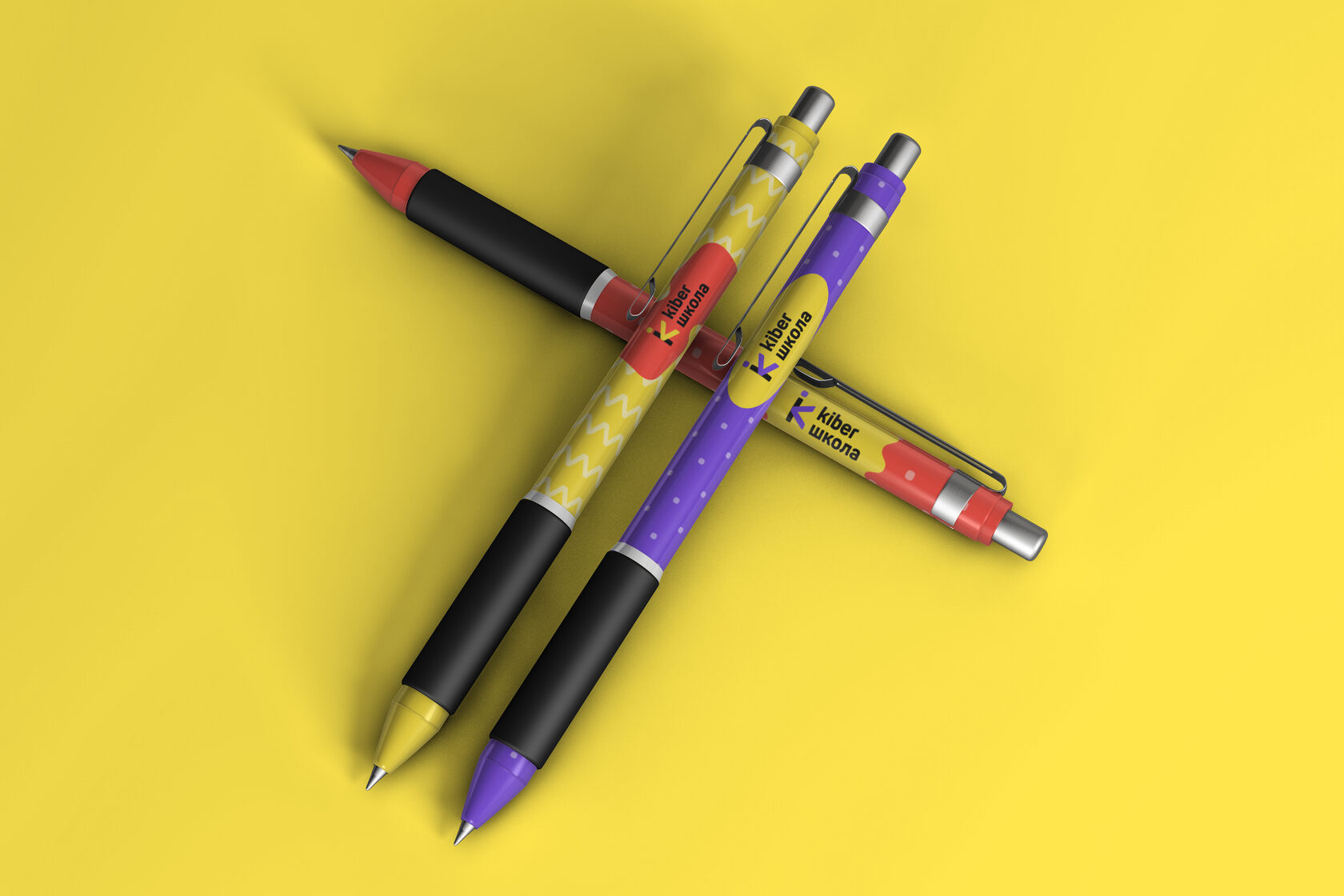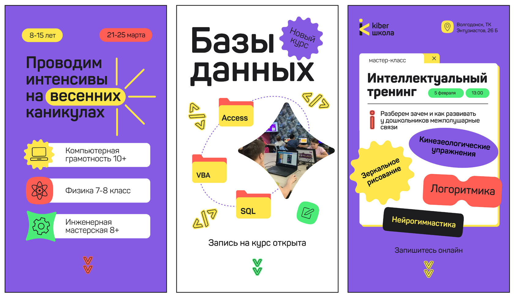Основная деятельность кибершколы — обучение детей и подростков компьютерным и техническим дисциплинам. Айдентика школы сочетает стиль дизайн-систем Memphis и UI: здесь есть яркие цвета, паттерны на фоне, элементы компьютерных интерфейсов, стикеры. Такой визуальный стиль подчеркивает характер деятельности школы и привлекает внимание целевой аудитории.