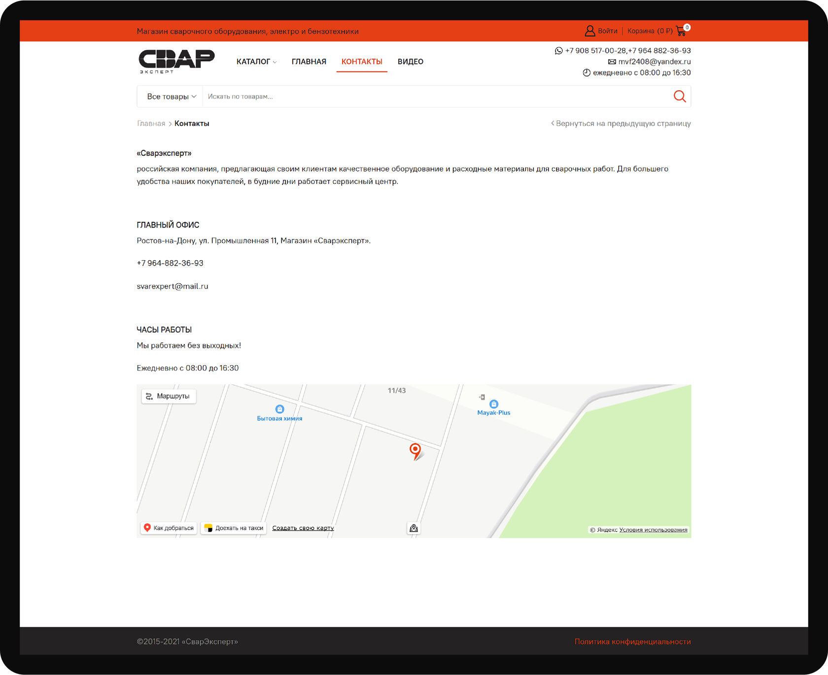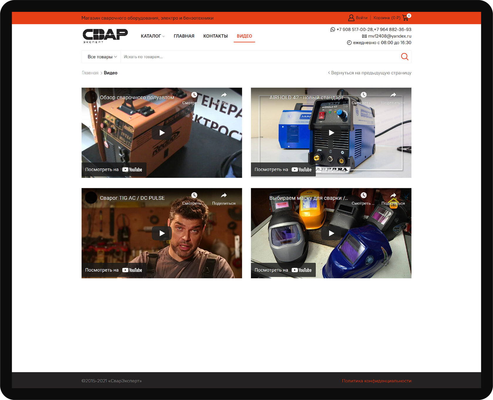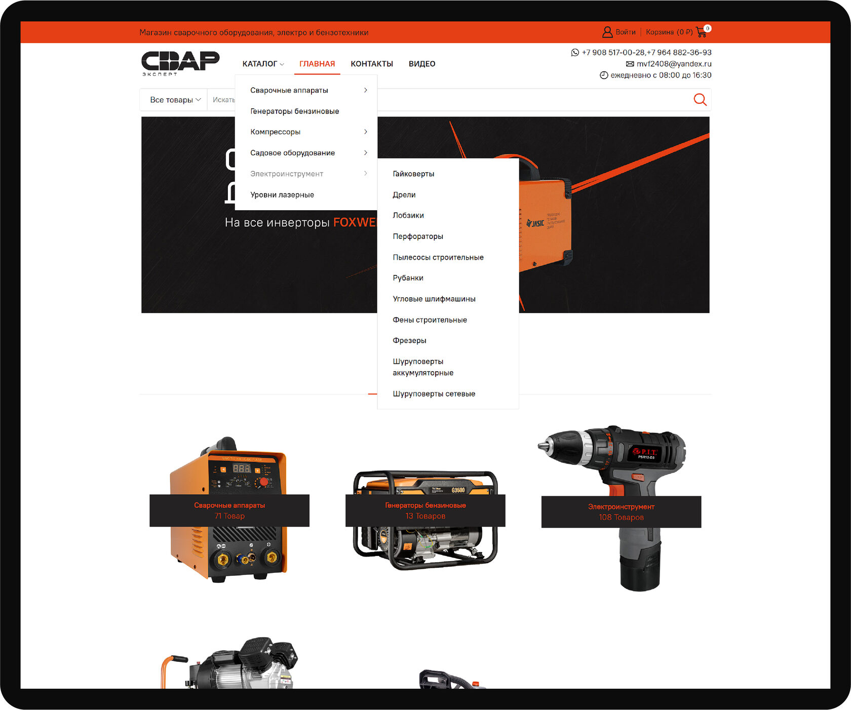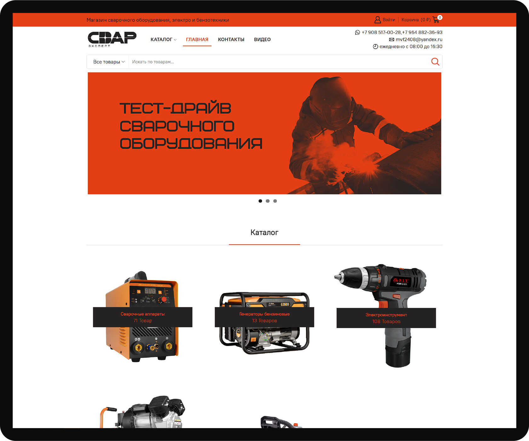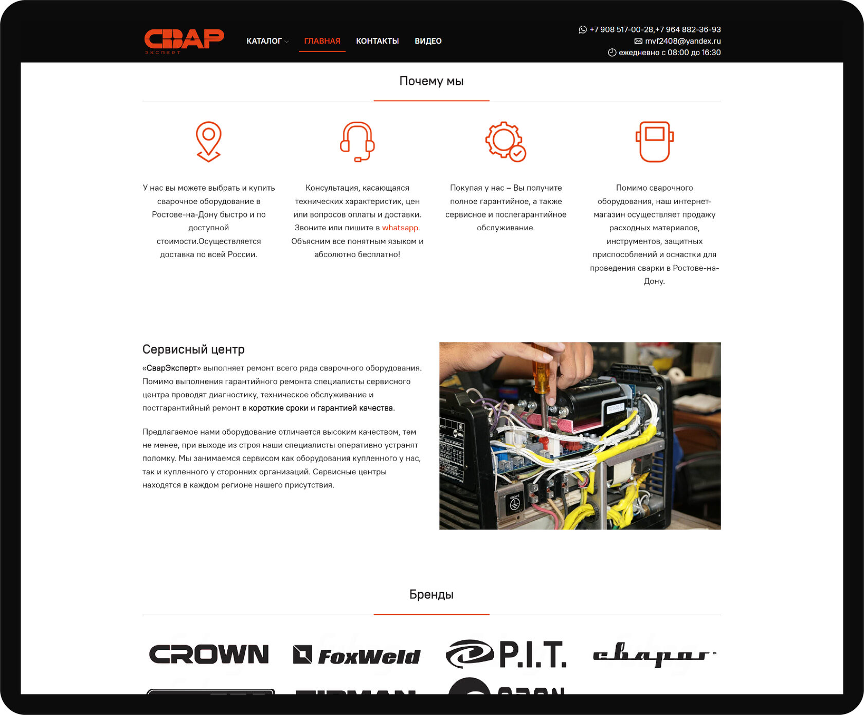 Разработан для компании Свар Эксперт, занимающейся продажей сварочного оборудования. Сайт оформлен в светлых тонах с использованием ярких и тёмных элементов для постановки контраста.